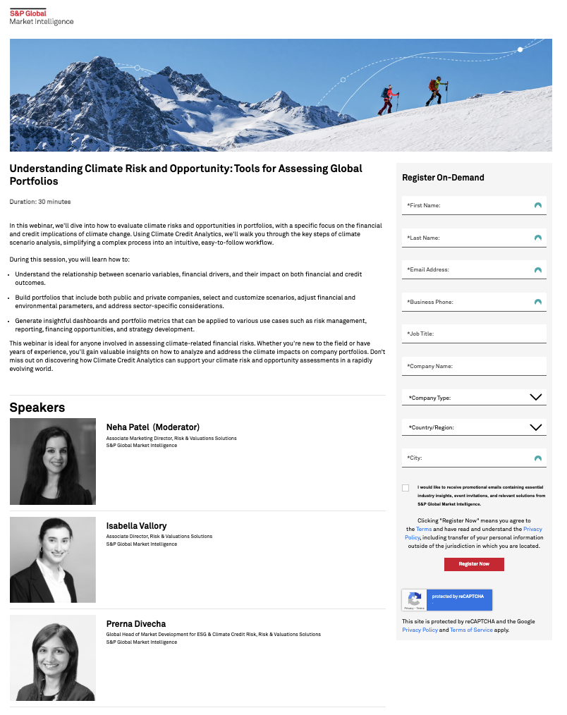 Objective S&P Global Market Intelligence sought to maximize high-level institutional attendance for an upcoming webinar on sustainability-related risk and valuation services. The goal was to secure live sign-ups and meaningful engagement from Director-level or higher decision-makers across major organizations, within a very short promotional window.